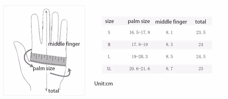 Measure the hand you normally write with around the palm at its widest the point in inches(excluding the thumb).Record circumference measurement-this will be your glove size.If you are between sizes,choose the smaller size.Gloves should be snug at first but will stretch.